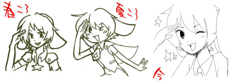先日にょたケロの原稿出した時に絵柄変えた?と言われたので(妹にも言われたぜ)そうかなぁと思って並べてみたら全部ポーズ同じで噴いた。しかししみじみとへったくそである。何だ腕とか。首とか。